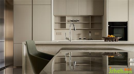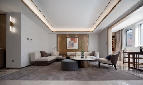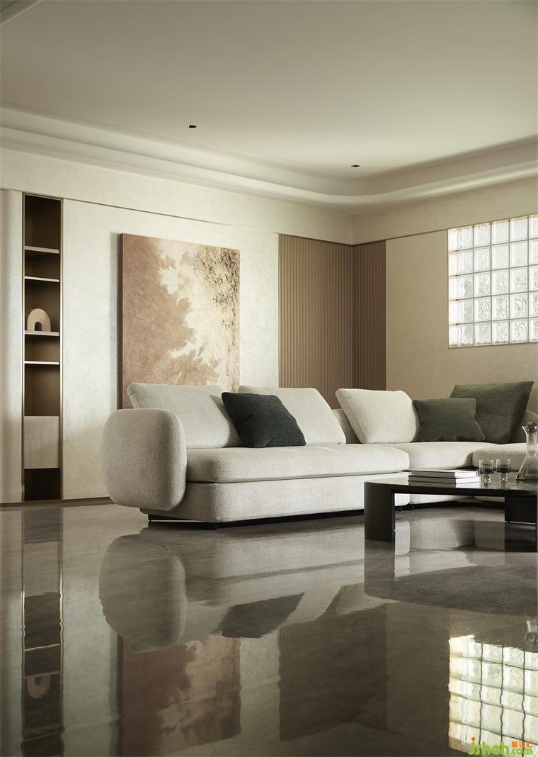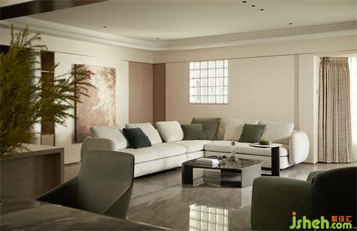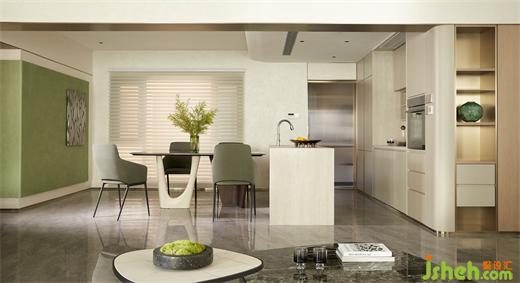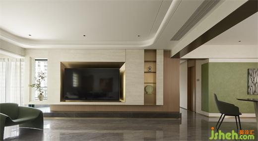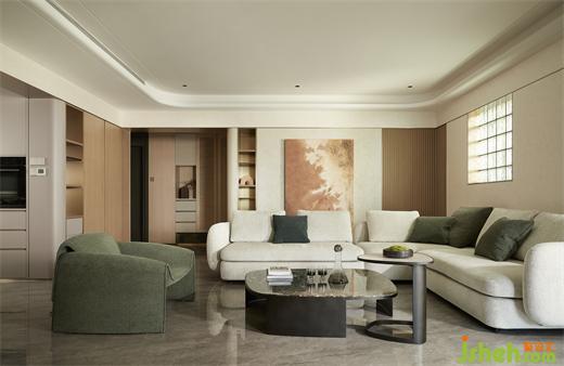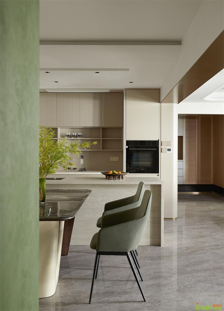 客廳沉穩(wěn)柔和的大地色系,包容著質(zhì)感、材料、光線的互動(dòng)與變化,住宅設(shè)計(jì)營(yíng)造素雅和簡(jiǎn)練的空間氣質(zhì)。弧線感的家具與建筑外窗呼應(yīng)成一體,跳躍的綠色藝術(shù)掛畫(huà)與橙色抱枕巧妙地打破了空間的沉悶感。在這個(gè)現(xiàn)代主義的時(shí)尚空間里,勾勒出溫婉親密的格調(diào)。