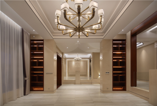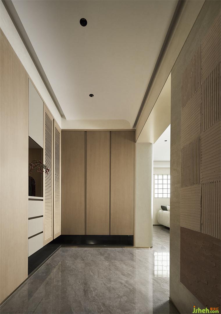 入戶玄關(guān)處,溫潤(rùn)的原木色構(gòu)成空間最初印象。通頂柜體保證了入戶整體的干凈清爽,搭配懸空設(shè)計(jì)拉升視覺(jué)感受。