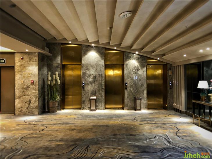 禧合酒店是一家主要承接喜宴及會議的主題式宴會酒店,本案位于哈爾濱南崗區(qū),主體為一家洗浴中心五樓的加建鋼結(jié)構(gòu)部分。在建筑結(jié)構(gòu)上室內(nèi)地面有2米左右的錯層,屋頂為鋼結(jié)構(gòu)尖頂,中間最高處舉架為5米多,最低點的天花高度為2.3米。綜合空間本身條件,設(shè)計團(tuán)隊希望通過多變的設(shè)計手法讓空間環(huán)境給使用者一種“沉浸式”的體驗感??腿私?jīng)過一樓接待區(qū),乘電梯直達(dá)五樓,映入眼簾的是無邊的星空,天花巧妙的燈光布置,無數(shù)的燈珠似繁星懸垂于上空,映照滿堂閃爍的光影。漫天晶瑩似乎觸手可及。寬敞的走廊既有利于宴會廳分流,也給后期運營提供了布場空間。