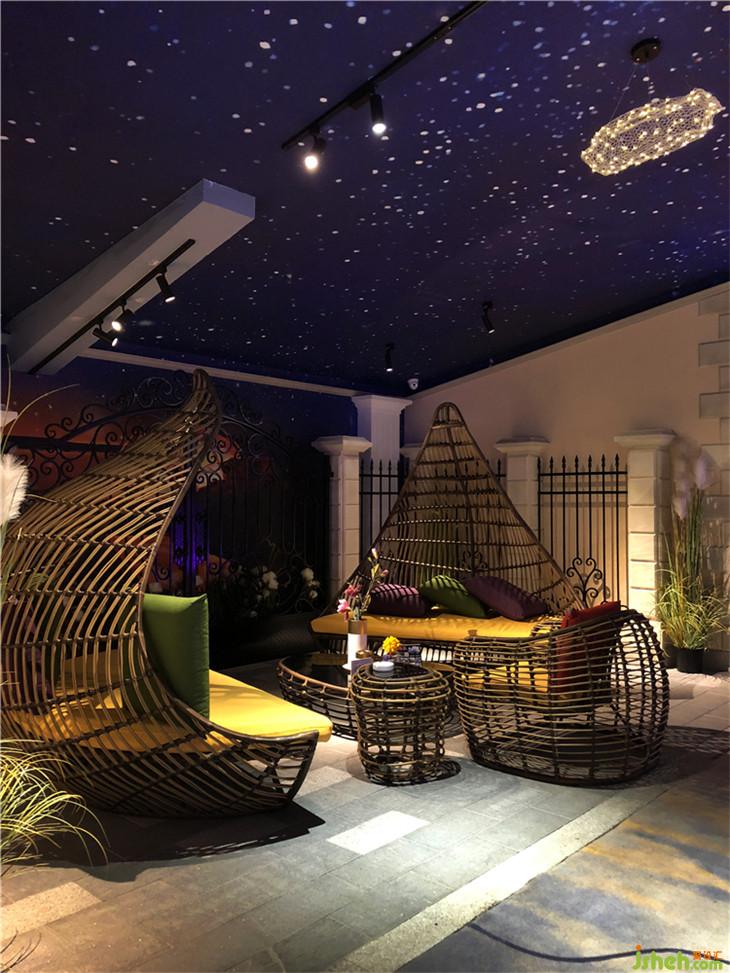 當(dāng)音樂響起,遠(yuǎn)處的海景房、海浪拍打沙灘、漸變的藍(lán)色燈光撲面而來,墻面自然色以及棚頂植物的綠色,同時也緩和了空間,突出造型結(jié)構(gòu)特點。桌椅選用白色,富有親和力,也使空間更為純凈。