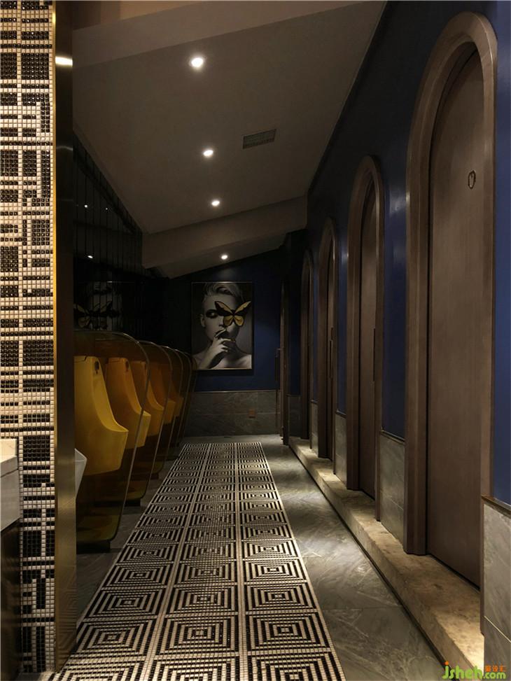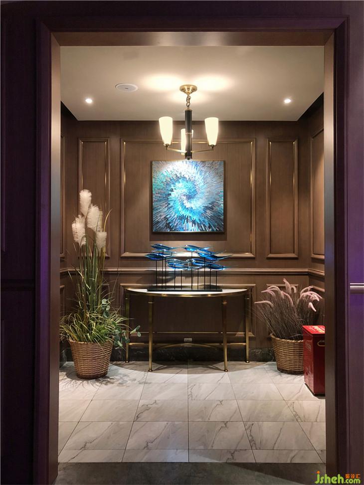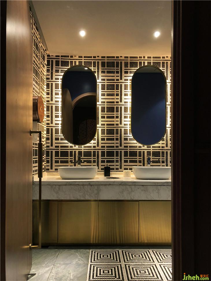 主要材料:古堡灰大理石、爵士白大理石、拉絲鈦金板、玫瑰金水波紋板、水洗秋香木飾面、星空壁紙等