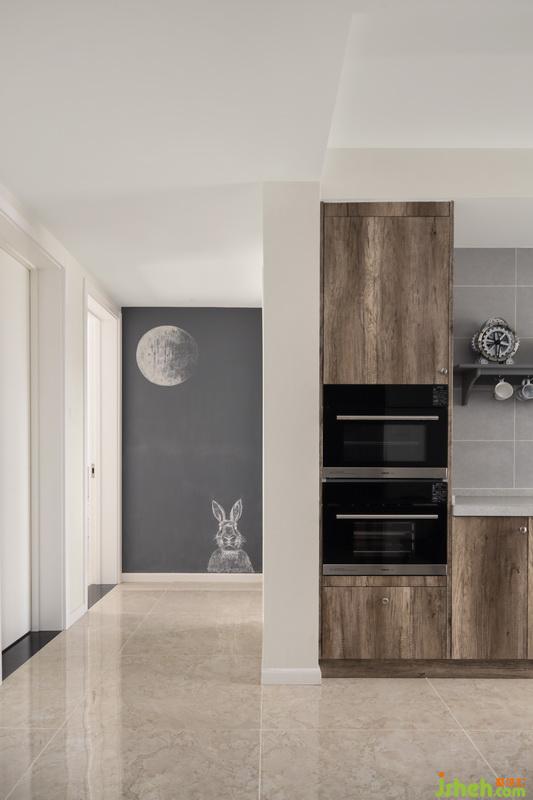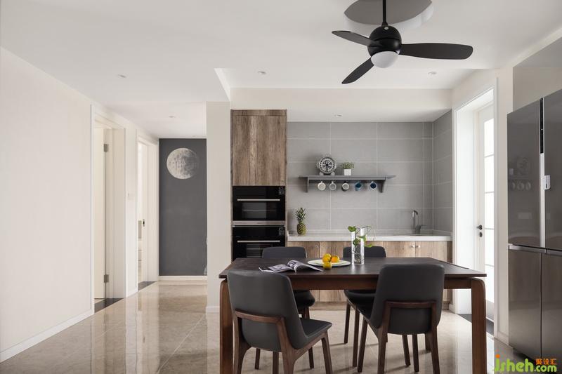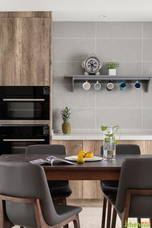 即便是同樣的灰色調(diào),利用小面積的綠色渲染,便讓廚房顯得獨(dú)立不同