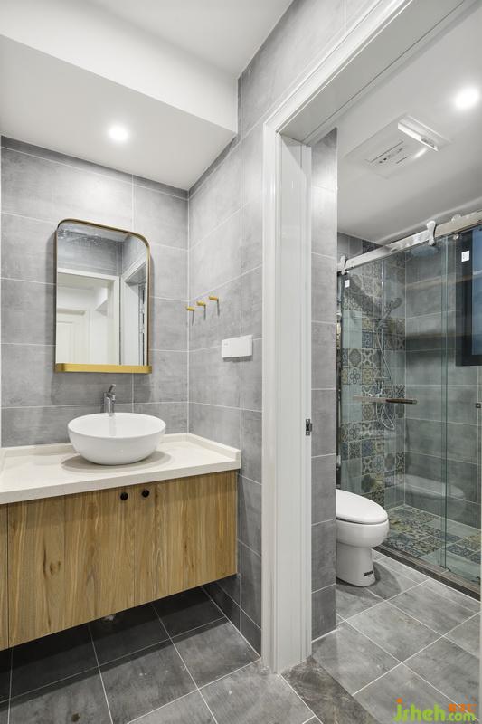 設(shè)計(jì)公司將原來(lái)一整個(gè)衛(wèi)生間干濕分離,在衛(wèi)生間里面隔出一個(gè)小的收納空間,解決了換洗衣物的收納,同時(shí)可以放浴巾等洗護(hù)用品;淋浴間的花磚打破水泥磚墻的單調(diào)乏味。