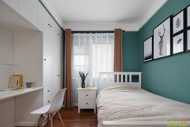 兒童房衣柜結合書桌,即滿足了儲物的實用性,又節(jié)省了臥室的空間,灰度藍墻面、大地色窗簾、動物森系風裝飾畫,使空間增加了小孩特有的純真。 室內設計師