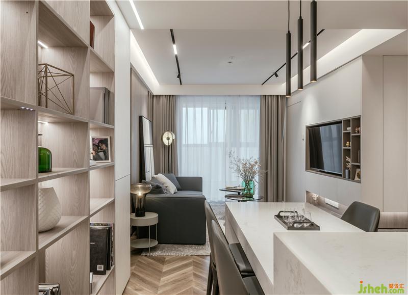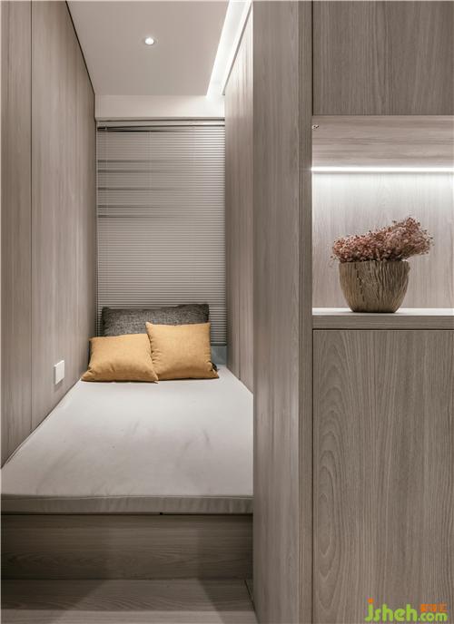 設計師把墻體整體向西邊移動之后,從入門口開始一整排的展示及收納柜,有開有合增加視覺審美效果,也增加柜子的實用性,入戶旁的房間做成榻榻米以及進門鞋柜,第一個踏步可當做換鞋凳去用,不僅增加儲物功能,偶爾來客人也能作為臨時客房。