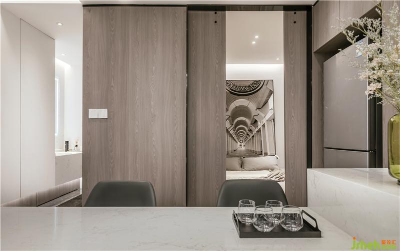 次臥室原有墻體也向西面移動,做成榻榻米形式,不僅增加儲物空間,床的面積區(qū)也是擴大,門的選擇為谷倉門,平時無人住的時候門打開后能看到一個很大的裝飾畫,也是一個很好的餐廳背景裝修。