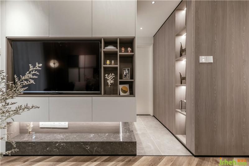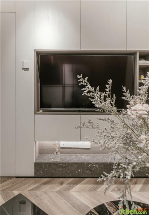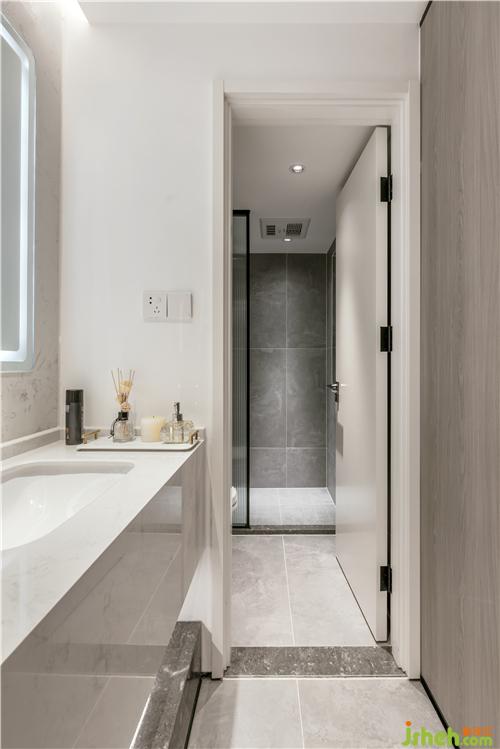 主臥隱形門和電視柜統(tǒng)一整體,有開(kāi)有合的柜子以及灰色大理石延伸到衛(wèi)生間,不僅增加儲(chǔ)物和使用功能的便捷,還有視覺(jué)上的美感提升。