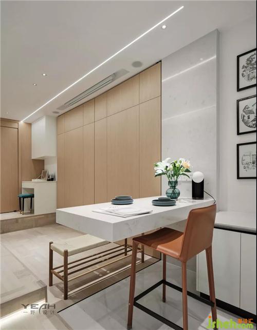 餐廳的設(shè)計(jì)上我們采用的是石材,從餐桌一直延伸到臺(tái)面高低錯(cuò)落滿足大人和小朋友同時(shí)就餐。同時(shí)地面,墻面,頂面 我們?nèi)坎捎冒咨浜蠠艄庠O(shè)計(jì)提亮整個(gè)室內(nèi)設(shè)計(jì)師空間。