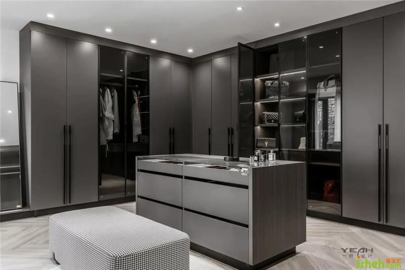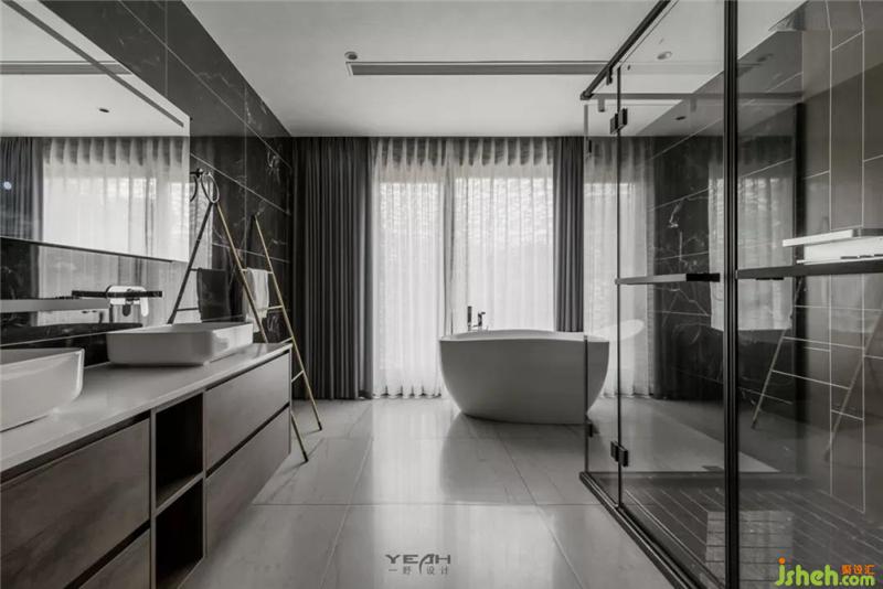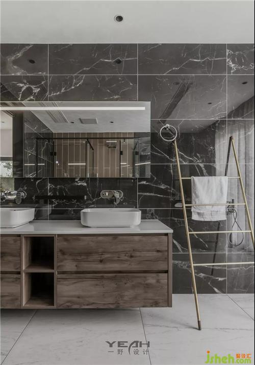 衛(wèi)生間大面積采用深灰色,裝修設(shè)計通過點光源局部照明點綴,營造高級、神秘、輕奢的氛圍。