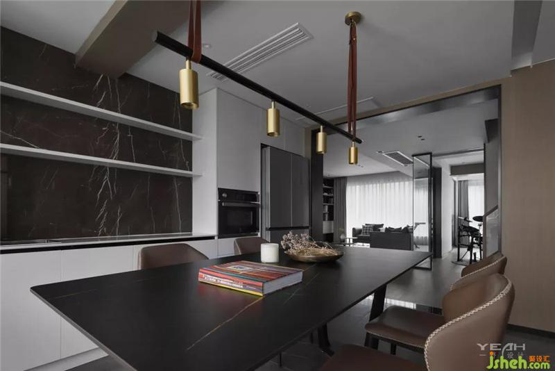 空間通過氛圍感染別人。在客廳中置入一整面的書柜,特意強(qiáng)調(diào)書柜的南北向延伸,室內(nèi)設(shè)計(jì)師順著光的方向,產(chǎn)生明暗,有了燈光的加持,就像是一個(gè)韻味綿延的文化長(zhǎng)廊,熏陶生活其中的人。