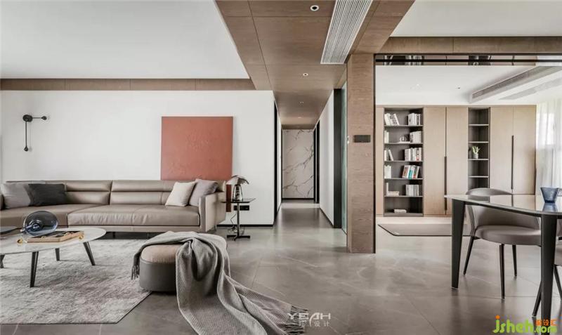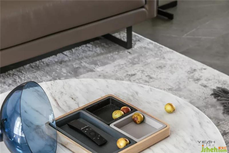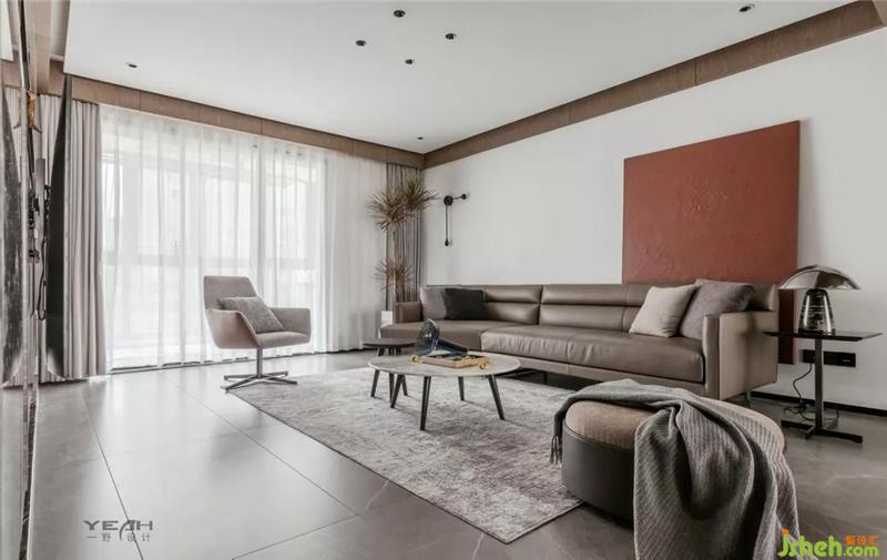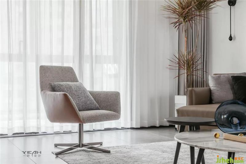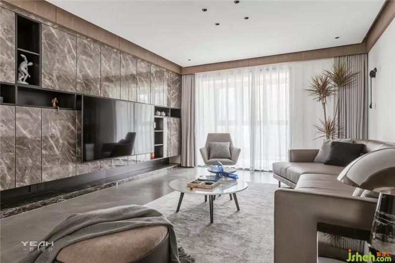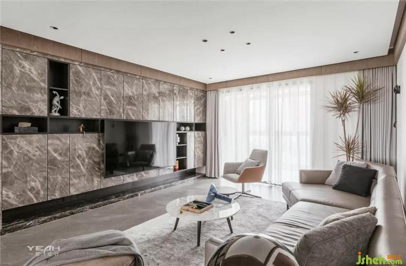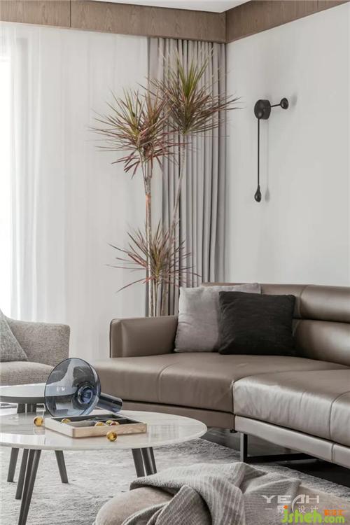 采用極簡風(fēng)格的家具搭配著深灰色質(zhì)感的啞光瓷磚,無主燈的設(shè)計,構(gòu)造了一種雅致的空間,同時與整體造型電視背景墻之間達到一種平衡。