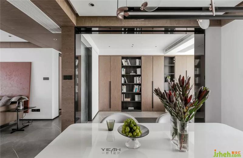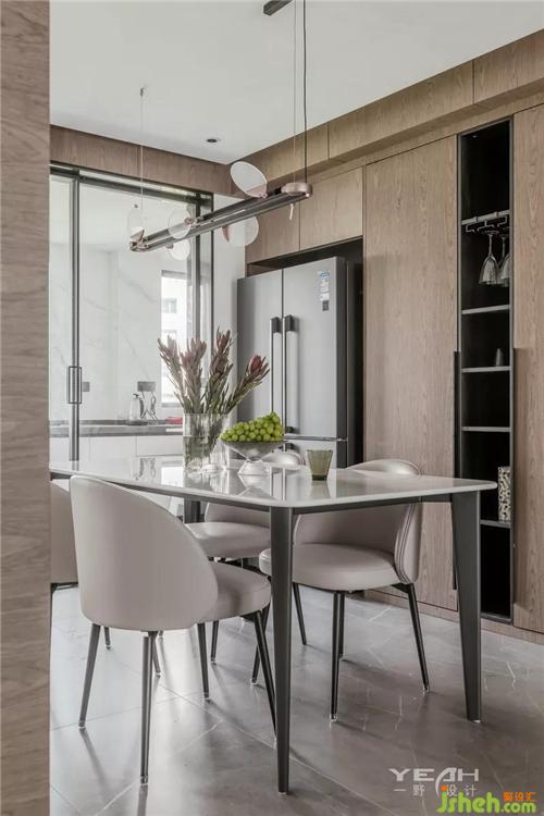 The dining room is connected to the activity space, with the intervention of black cabinets, translucent frosted glass, interspersed with soft lighting and finishes, and closely connected with the living room.