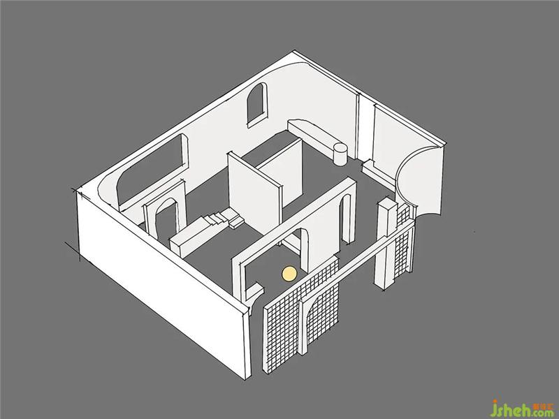 展廳選擇在原有的方塊空間再搭建一層結構,保留原來的窗,窗戶做了弧形處理,在穿梭中找到規(guī)律,再延伸。