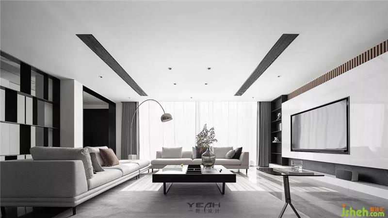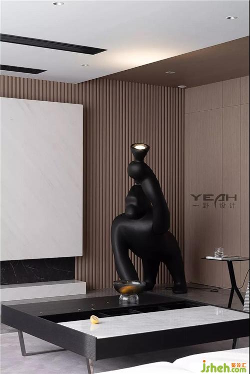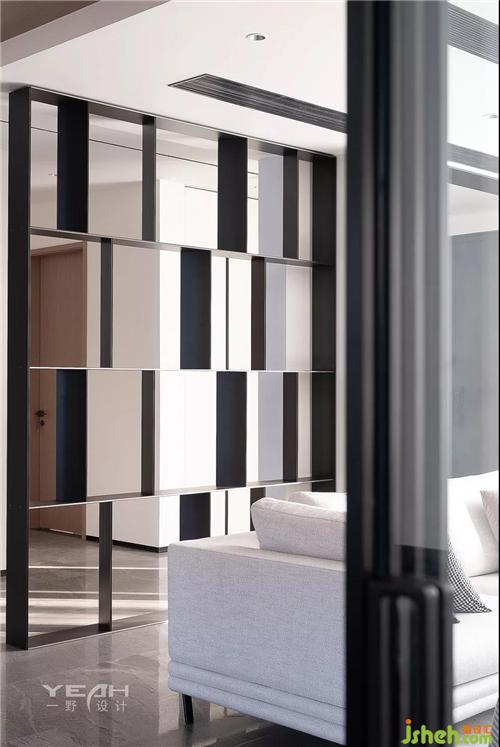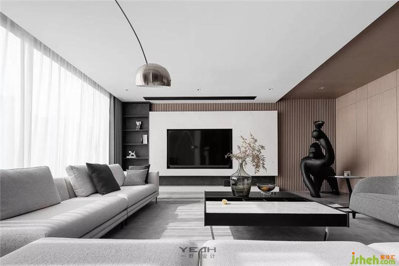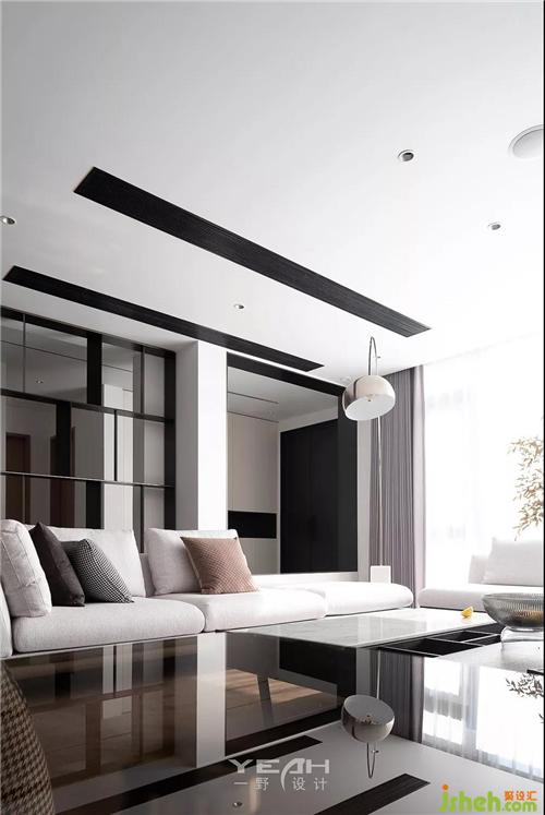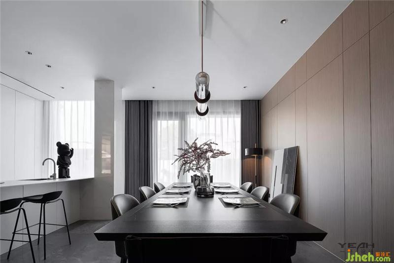 In the original black and white gray system, add wood color, space color so as to orderly and rich. From the ceiling top to the TV background wall, a weak contrast is formed through white and wood color, which not only visually divides the dining room area.