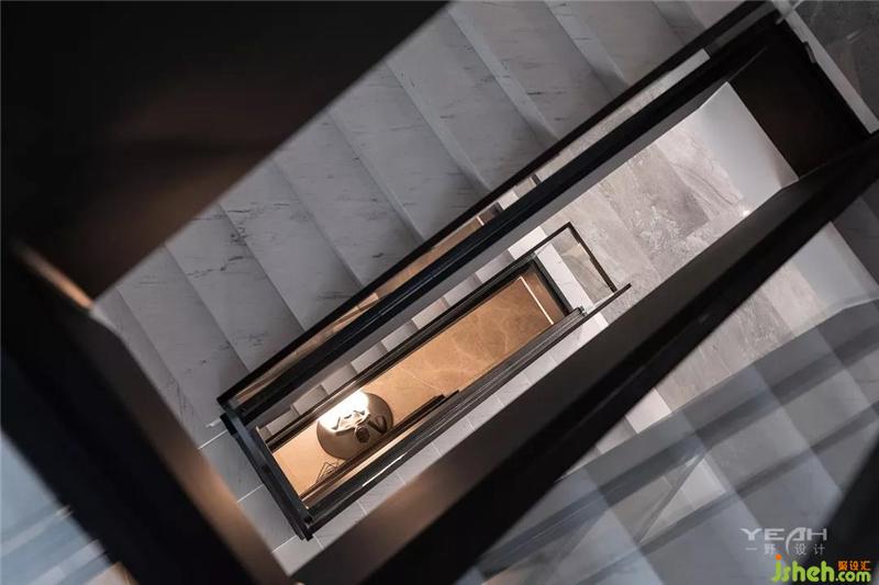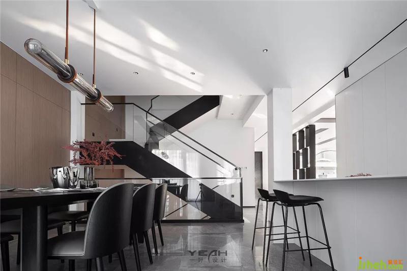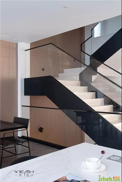 Stair, transparent glass and black metal are united in union, perforated contracted, easy design style. The design achieves the combination of points, lines and surfaces, so that the stairs become the link of space communication.