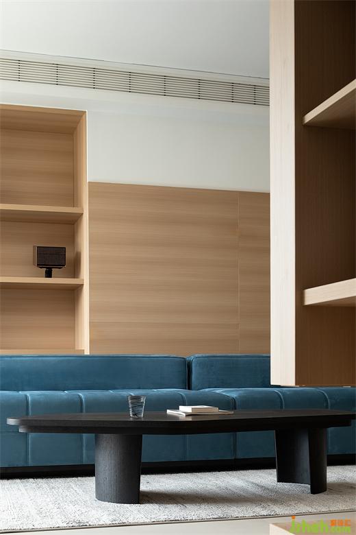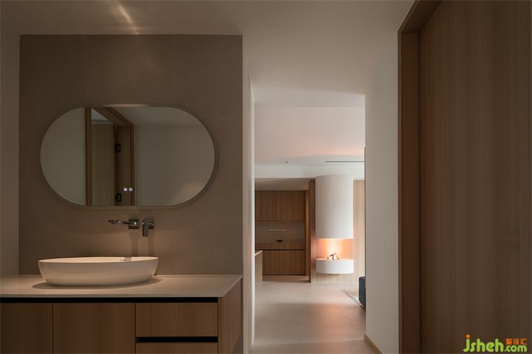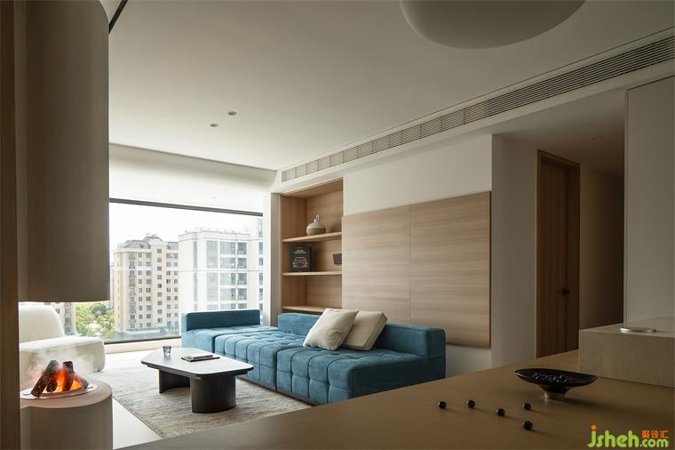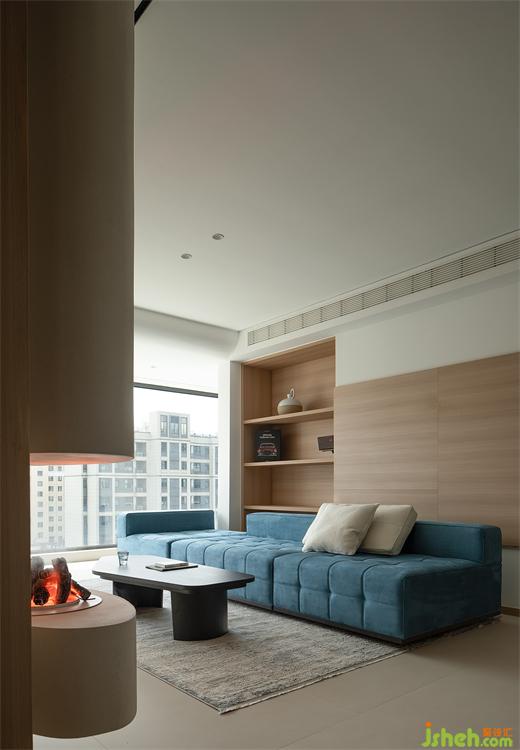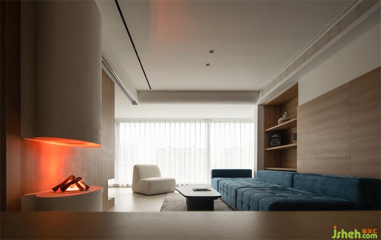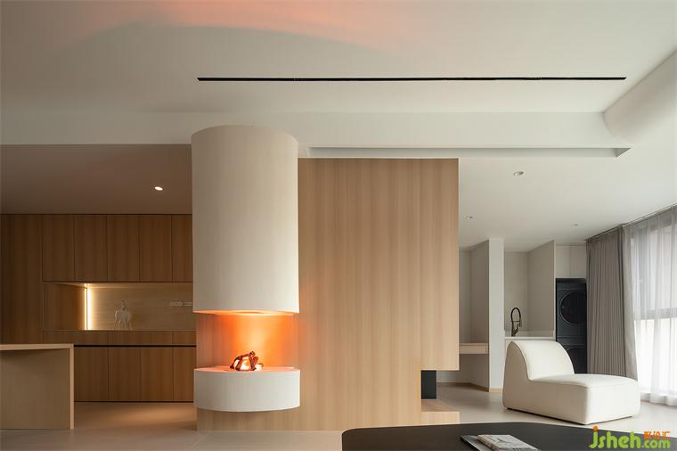 立體壁爐以弧形呈現(xiàn)在室內(nèi),懸挑結(jié)構(gòu)釋放空間個(gè)性。家具的布置不以繁縟花飾取勝,而是注重流暢簡(jiǎn)潔的線條美,呈現(xiàn)層次錯(cuò)落有致的視覺(jué)感,恰到好處地保留各自應(yīng)有的獨(dú)立性。清簡(jiǎn)的配色、柔軟的材質(zhì),敘述著空間中漫不經(jīng)心的閑適與悠然。