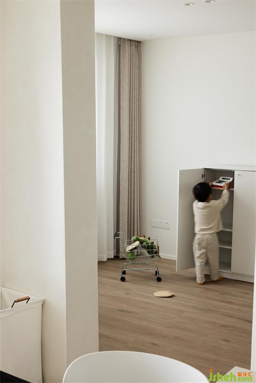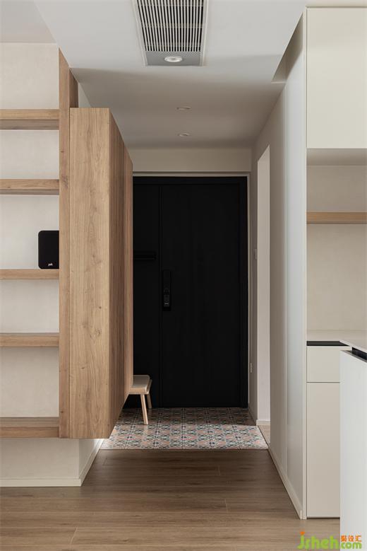 入戶玄關以原木色為主,搭配花紋瓷磚,細膩精致,點綴空間色彩之余,也為生活增添了一絲趣味性。一把方凳小巧溫潤,潛藏著細致入微的貼心。湖左岸大平層裝修設計懸挑式鞋柜增添空間立體感與時尚度的同時,也為日常清潔提供便利。
