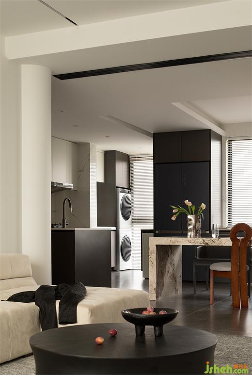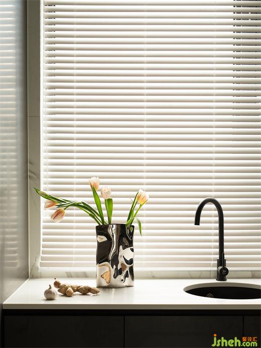 家裝設(shè)計(jì)打破常規(guī)的開放式設(shè)計(jì),將各個(gè)功能區(qū)自然銜接,消弭空間的邊界感,保證動線的自由流暢,讓日常生活更為便捷。島臺上盛放著一日三餐的煙火人間,不規(guī)則的金屬花瓶和幾束郁金香使空間的藝術(shù)感更為強(qiáng)烈。