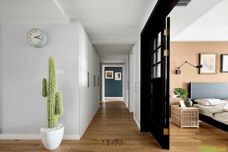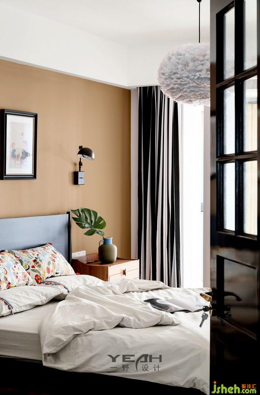 室內(nèi)設(shè)計(jì)師用黑色木框玻璃折疊門,保證了空間的通透性,拉上窗簾,私密性同樣也得到了保證