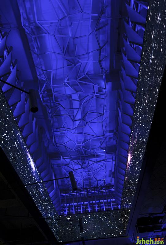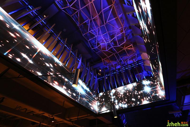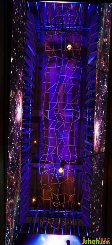 中庭是整個(gè)空間的視覺中心,屏幕承擔(dān)了場(chǎng)景營造的主要功能,變幻無窮的星空景象,給人以身臨其境之感。上方運(yùn)用不規(guī)則鋼條搭建出類似起伏山坡的造型,異型柵條圍繞二層形成護(hù)墻與此形成呼應(yīng),在視覺上共同構(gòu)筑出邊界感,如同乘坐未來的飛船在宇宙中遨游,身處繁星的懷抱之中。