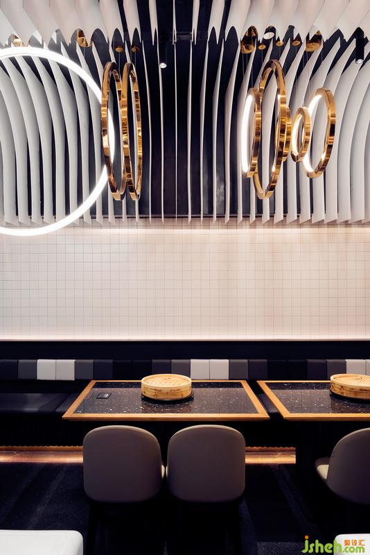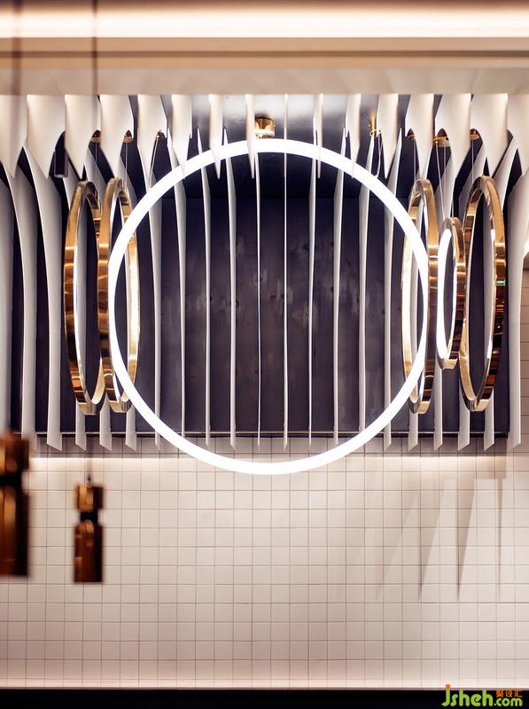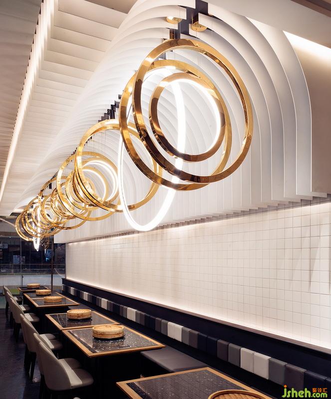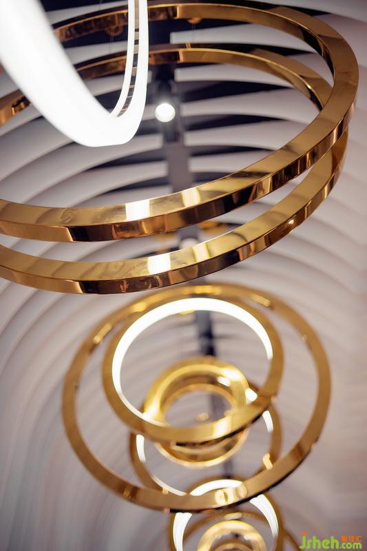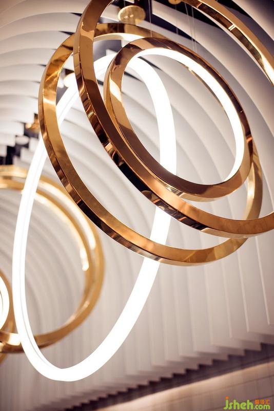設(shè)計概況:空間整體由曲線和直線線條構(gòu)成,室內(nèi)設(shè)計師巧妙地利用燈光效果,搭配金屬質(zhì)感的圓環(huán)裝飾,打造出一種燈火闌珊的視覺體驗。