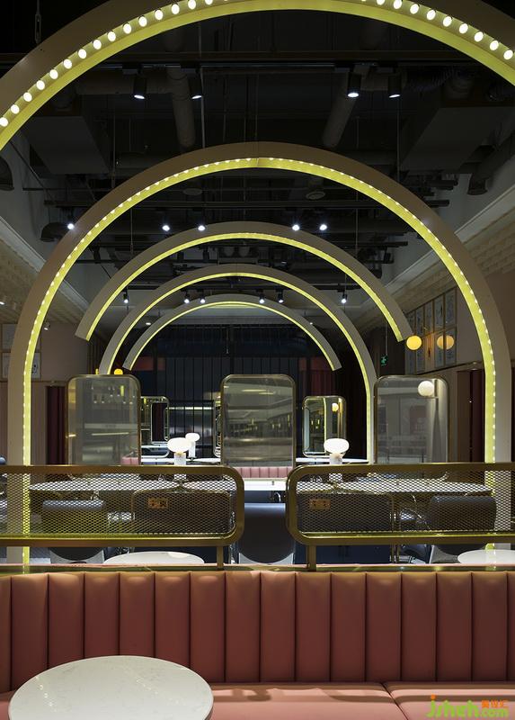燈光往往是美發(fā)店裝飾中最重要的手段之一,而整個(gè)美發(fā)店的服務(wù)區(qū)域集中在了大廳中央,為了避免敞開式空間的過(guò)分空曠,室內(nèi)設(shè)計(jì)師通過(guò)選用連排的拱形吊燈以層層遞進(jìn)的視覺(jué)效果,將這一區(qū)域進(jìn)行了集中表現(xiàn)。