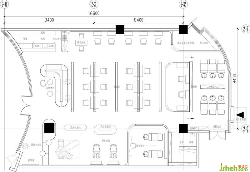 工作室入口處設(shè)有顧客休息區(qū),粉紅色的環(huán)形沙發(fā)既提供了足夠的顧客承載量,室內(nèi)設(shè)計(jì)師又以7型的設(shè)計(jì)巧妙的將入口、前臺(tái)、大廳進(jìn)行了區(qū)域劃分。前臺(tái)著重加強(qiáng)了整體采光,除了滿足工作過(guò)程中的收銀、詢問(wèn)等基本服務(wù)外,也通過(guò)燈光的聚集對(duì)顧客進(jìn)行了引導(dǎo)。