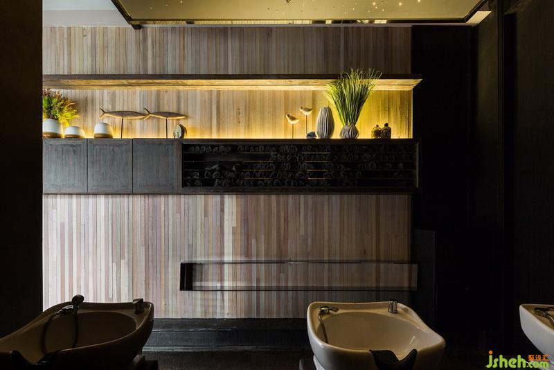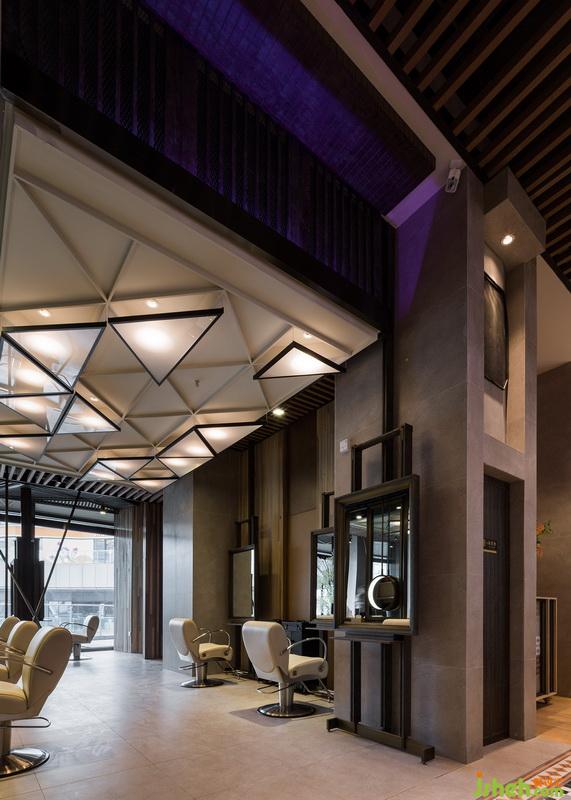 剪發(fā)區(qū)木質(zhì)墻面帶來的質(zhì)感和安靜的色彩讓人放松、愜意,設(shè)計感強(qiáng)烈的三角頂燈散發(fā)柔和均勻的光澤,幾何形狀燈飾與流線型梳妝臺面相輝映。