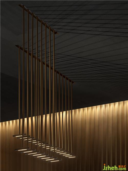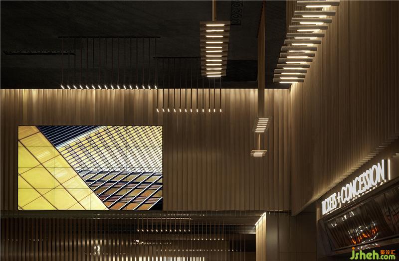 大堂中也以此方式來設計不同功能區(qū)之間的隔斷,分開大堂和入場通道。層層疊疊錯落的格柵效果,產生另外一種特殊的光影視覺。我們也將“琴弦”的概念延續(xù)設計出了一款定制的燈具,一根根從天花上吊裝下來的燈具,通過不同的長度和平行的排列方式。這種好似琴弦線一樣燈具,讓觀者時刻感受到這一設計的主題概念。電影院設計