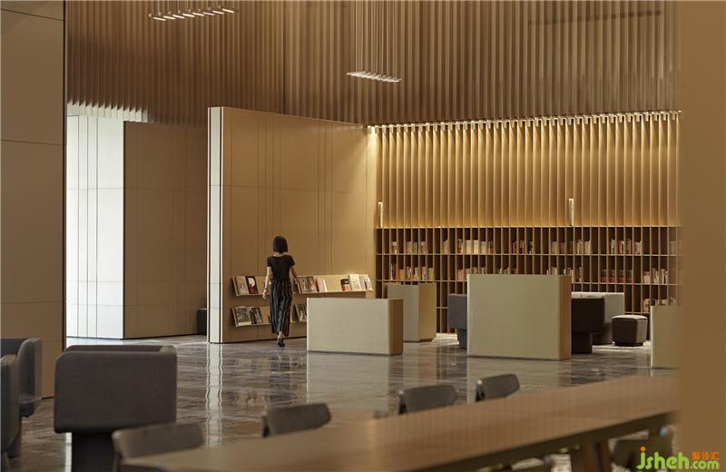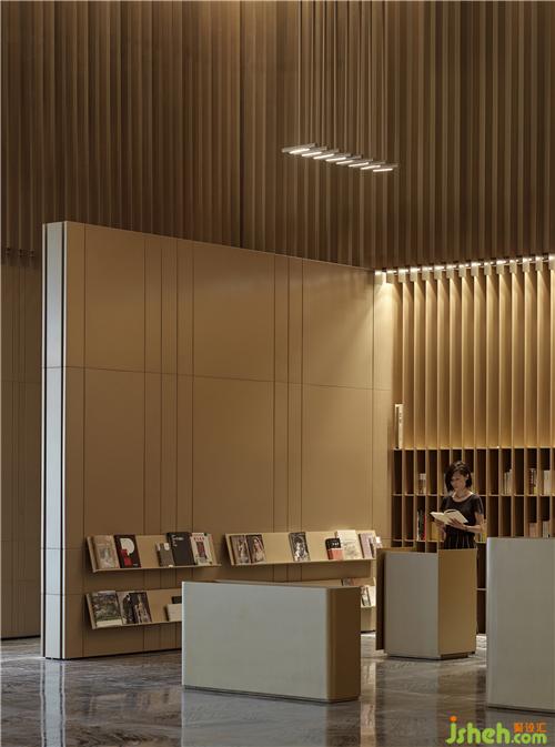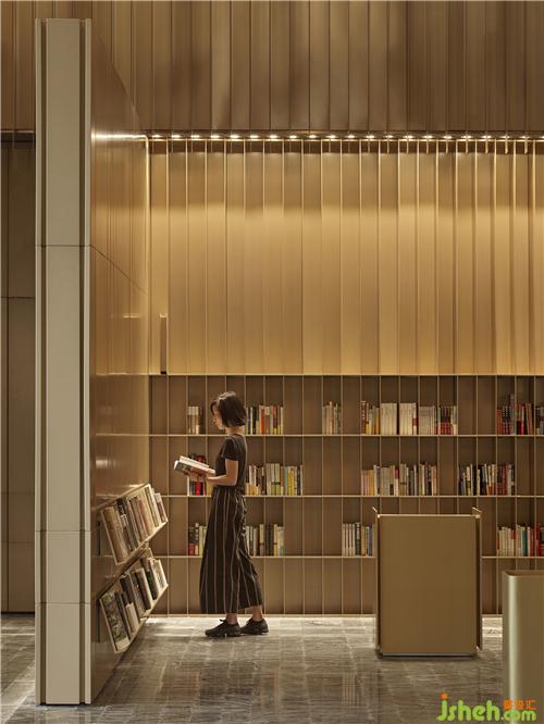 地面石材的拼接,兩種不同質地和顏色的石材,在大堂中排列開來,平行縱橫拼接,且與天花上的造型燈相呼應。書架以及隔斷之間所形成的呼應關系,讓金色的金屬質感在空間中更加明顯。大堂中的賣品區(qū)和書吧分別在大堂的兩端,相互融合卻互不打擾,讓兩邊的顧客能夠各取所需,享受屬于自己的閑暇時光。