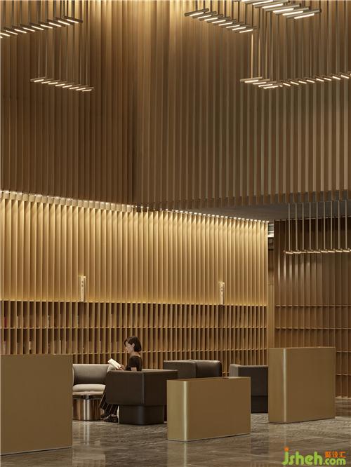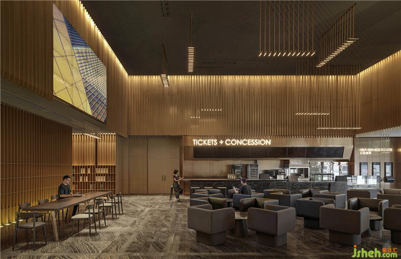 每一根琴弦平行排列,從低音到高音,根根琴弦清晰可見,供樂手演奏,設計師將“琴弦”特點融入到空間設計之中。于是,設計師將影院的大堂四周設計成一列列豎向的格柵,并且從天花一直延伸到地面。整個項目從最開始的功能設計階段,就考慮融入一個小型的書店,設計師腦中浮現文人雅士撫琴讀書的場景,于是我們也將琴弦的概念統(tǒng)一的表現在書店的部分,來增強這兩種文化元素的組合;統(tǒng)一的設計手法延伸到書店,圖書區(qū)書架與整體造型一致,延伸下來的造型,其中三層被用作書架使用;琴弦和圖書的組合,讓人們在休息區(qū)別外增添了一份禪意,我們也并沒有用過多和過于復雜的顏色,用燈光的效果來增強空間之中的光影變化,以此來強調其文化的屬性和特點。電影院設計