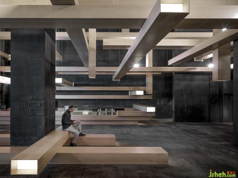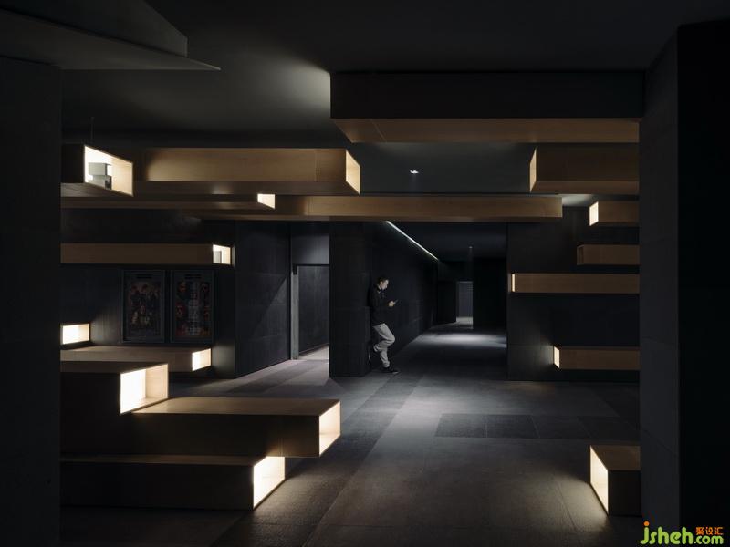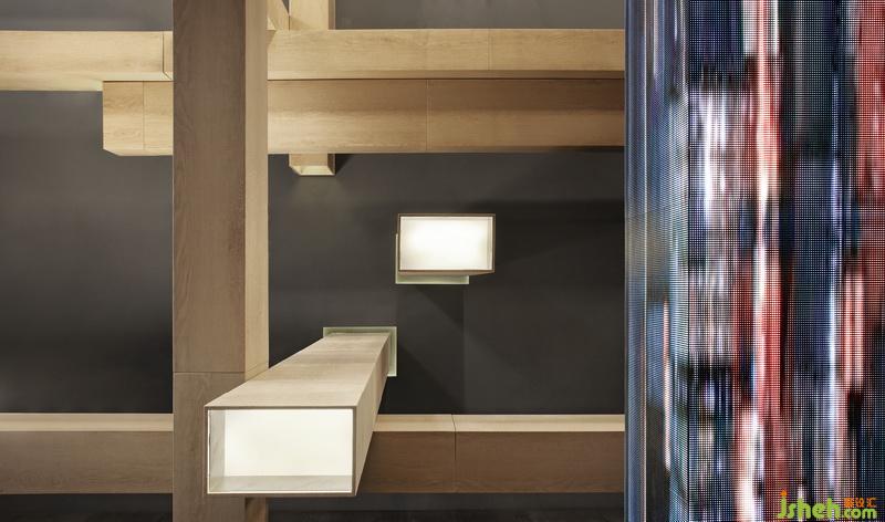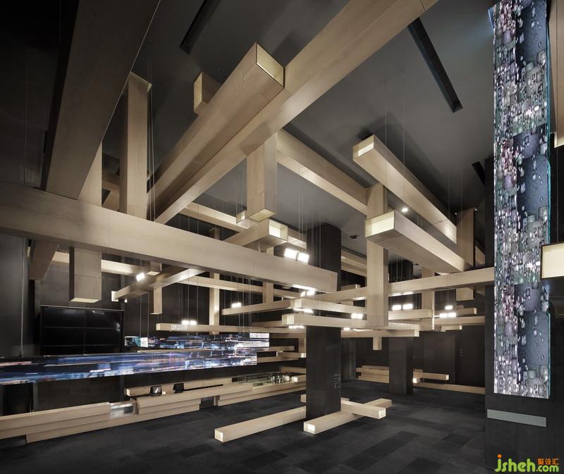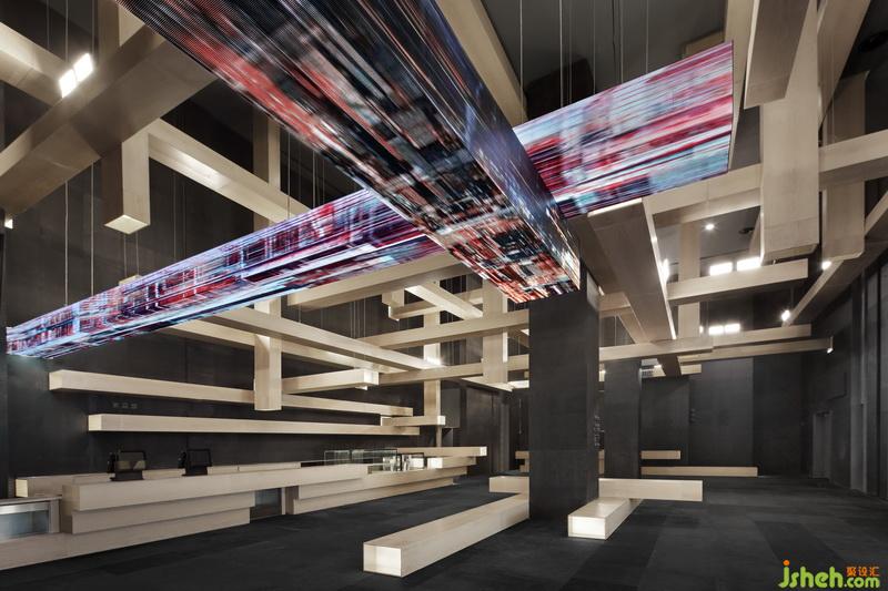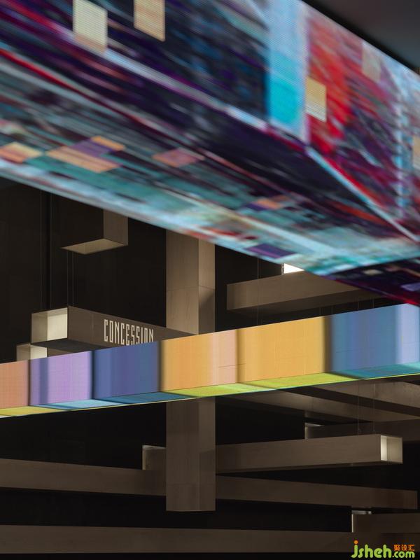 室內(nèi)設(shè)計師把暗箱都拉長,成為一條條長方柱體,在大堂的天花互相交錯,形成一個富立體感的天花裝飾。成直角而且有高有低的排列方式讓天花裝飾線條鮮明利落, 亦不會產(chǎn)生壓迫感。柱體由淺色的木紋鋁板制成,在黑色的墻壁和天花的襯托下更顯突出。這些柱體的末端都安裝有小電視機(jī)以播放電影片段,模仿投射在暗箱里的影像。設(shè)計公司同時在柱體的另一端安裝了燈泡,不但讓天花裝飾更加搶眼,也起了照明的作用。這些鋁柱體之間有幾條LED屏幕組成的長柱體,投影型格的圖像, 而且粗幼跟其余的鋁制柱體稍稍不同,為天花裝飾增添變化。