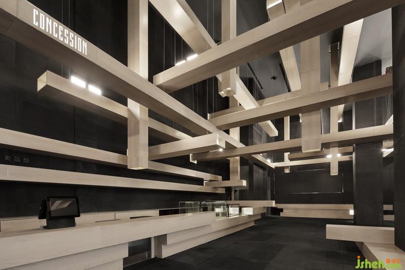 這些長方柱體除了用作裝飾,也融入到影院的設(shè)施。長方柱體重迭在一起,成為 了影院的售票處和小賣部,跟天花裝飾互相呼應(yīng)。走廊的兩旁是橫著放的長方柱體,靠近地面的柱體成為了供觀眾坐下休息的長椅,而掛得較高的柱體則標(biāo)示了影廳的號碼。有別于一般只供觀賞的裝飾,觀眾除了置身這些拉長了的暗箱之中, 更能確實(shí)使用這些裝飾。大堂的地毯設(shè)計公司選用了不同深淺的灰色,模仿柱體交迭的形態(tài),就如天花裝飾投影在地下的影子,連接起整個大堂的設(shè)計。