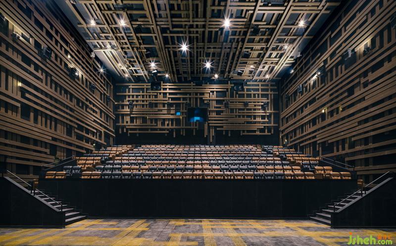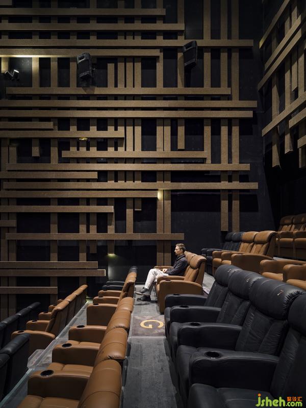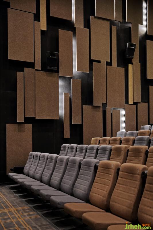 暗箱的主題一直延續(xù)到影廳的設(shè)計,影廳的天花和墻壁都鋪滿了很多以吸音物料制成的長方柱體,這些吸音條的末端同樣安裝了燈源作照明之用,就好像引入了大堂的裝飾。影廳的地毯同樣印有跟天花裝飾呼應(yīng)的長條形圖案,整個影廳的線條都非常和諧。影廳的主要色調(diào)為橙黃色,比大堂的氣氛更為溫暖柔和,讓觀眾能放松地等待欣賞電影。影院的洗手間設(shè)計公司同樣揉合了暗箱的主題,大堂的長方柱體變寬,成為了洗手盤,讓大堂和洗手間的裝飾互相連貫,也讓觀眾能夠近距離觀賞。