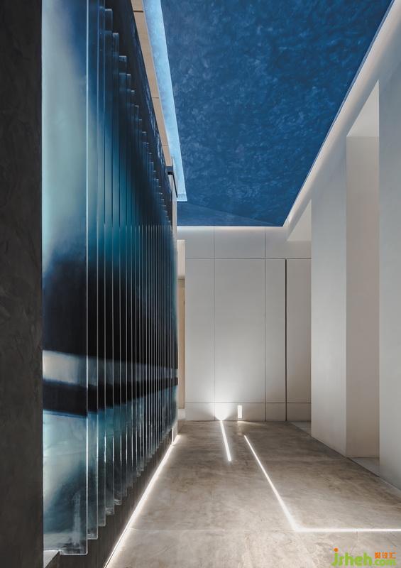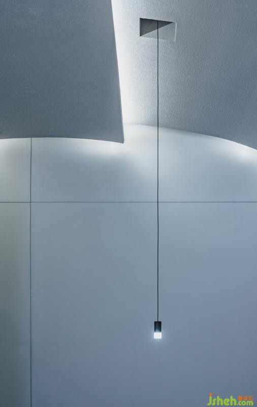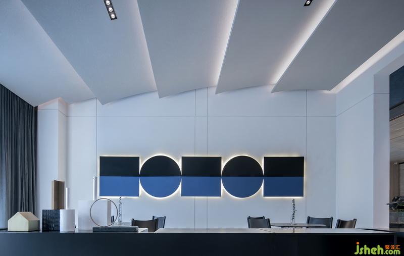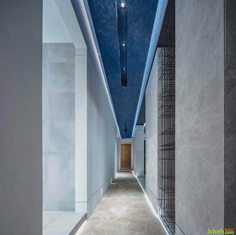 幾何感的室內(nèi)以灰白為主,在灰調(diào)的基礎(chǔ)上大膽用色,打翻了甘藍(lán)顏料桶,發(fā)揮出空間隨性。藍(lán)色是理智和安祥的象征,白色給人以清爽無(wú)瑕感。凌厲的筆法構(gòu)建空間感官錯(cuò)覺(jué)和視覺(jué)沖擊,在清新的色調(diào)中,棱角變得柔和,厚重得到分解。色彩的提煉促使氛圍尤為明晰,又掠過(guò)淡淡橘黃,暖意無(wú)疑是超脫場(chǎng)景外最充滿吸引力的。