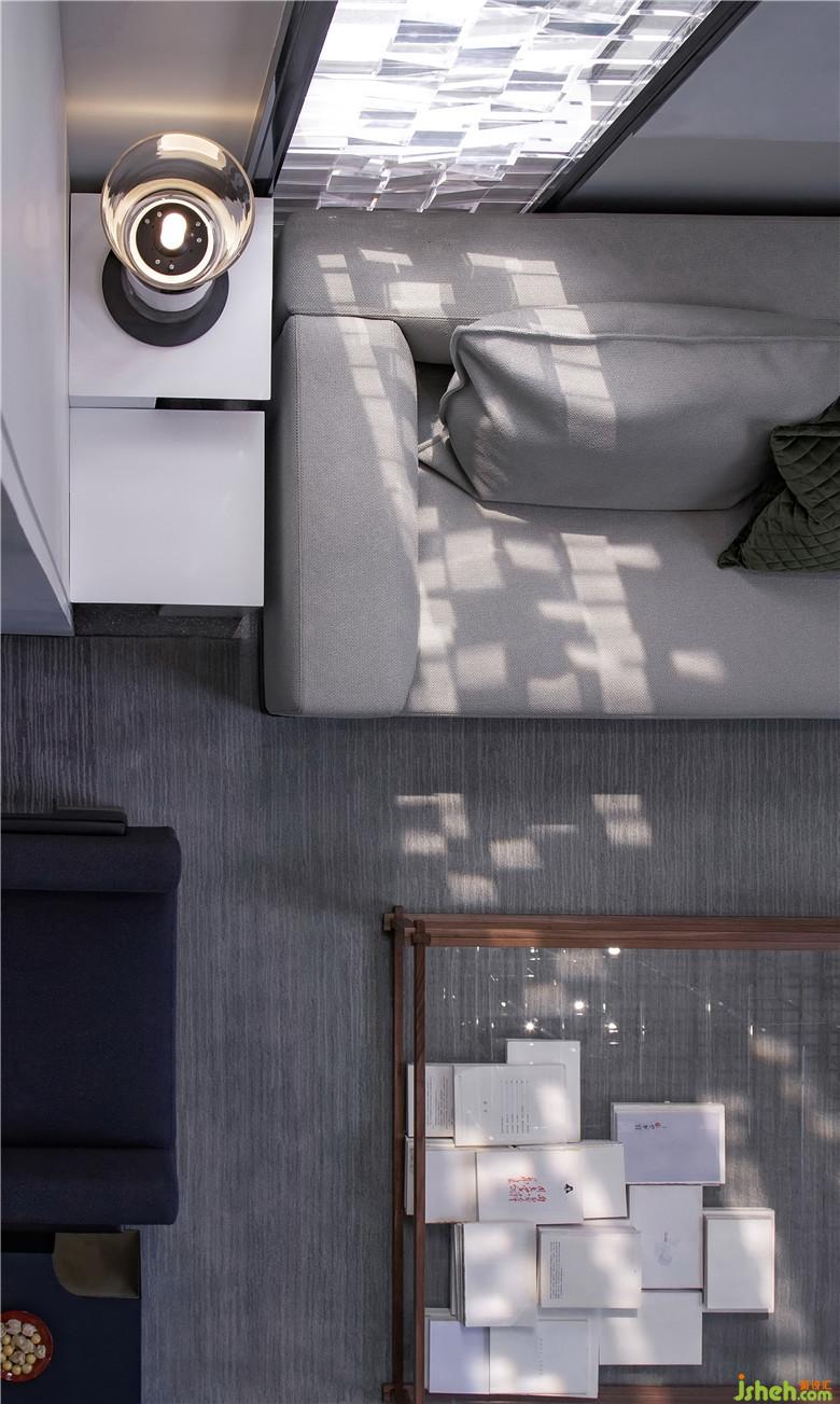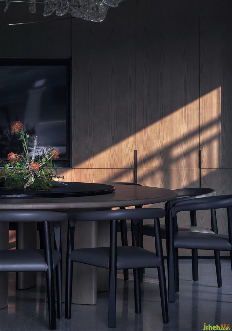 客廳中最搶眼的地方當(dāng)屬沙發(fā)背景墻兩側(cè)的巨型落地窗,但由于其外形過(guò)長(zhǎng),且位于西曬的方位,除了使原本不算高挑的空間失去比例的平衡之外,過(guò)強(qiáng)的直射光也成為設(shè)計(jì)之初的最大難題。在業(yè)主要求完整保留整扇窗戶(hù)的前提下,為了同時(shí)實(shí)現(xiàn)功能和視覺(jué)的完美表達(dá):我們嘗試通過(guò)用極簡(jiǎn)的造型來(lái)弱化視覺(jué)上的感受,材料上選用了特殊的有機(jī)玻璃,當(dāng)陽(yáng)光通過(guò)凹凸結(jié)構(gòu)的窗格射進(jìn)室內(nèi),散射的光源就變成了星星點(diǎn)點(diǎn)的光斑撒落一地,像調(diào)皮的精靈,在不同的時(shí)段,自由地變換各異的形態(tài)游走于空間的各個(gè)角落中,成為了極具欣賞趣味的藝術(shù)裝置,讓室外的光線變化成為室內(nèi)自然的呼應(yīng)與延展。