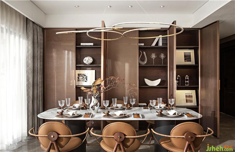 皮質(zhì)、石材、金屬構(gòu)成的就餐氛圍:典雅舒適、主次有序、冷暖適宜。