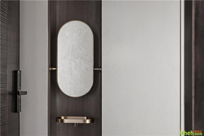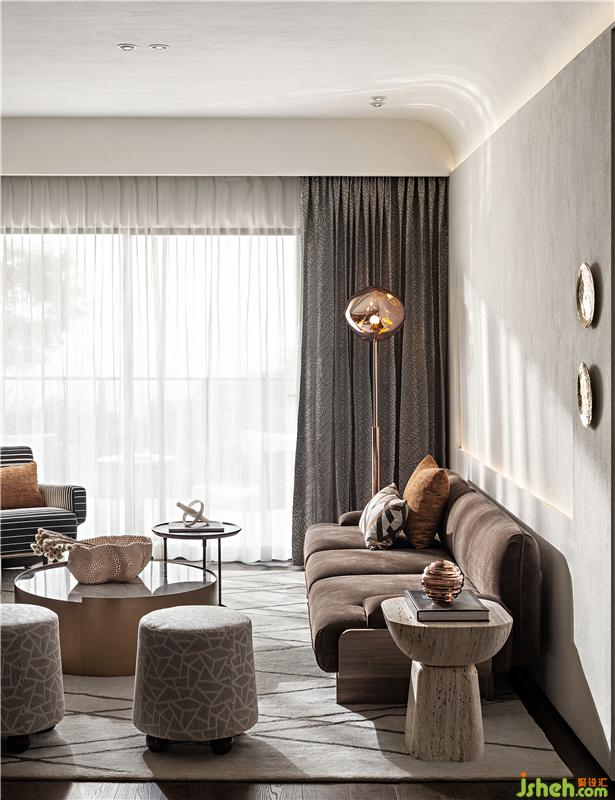 客廳以自然、舒適的氛圍為主,讓都市生活中的繁雜日常回歸質樸、平靜。電視背景墻由精細打磨的木飾面和利落的黑鋼組成,是自然和現(xiàn)代的最佳融合。沙發(fā)背景墻精準的計算出一處縫隙位,把光線藏匿其中,順勢而上在頂部的蜿蜒處自然的傾瀉而下,模擬自然光在室內的分布。