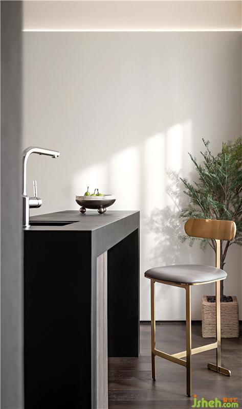 靠窗一隅,巧妙的設計了吧臺并連接餐桌,除了起著劃分空間的作用,更是為主人家的生活注入新的趣味性和便捷性:閑時雙人而坐,在舉杯談笑沐浴陽光時,拉近人與人之間的距離。