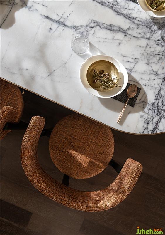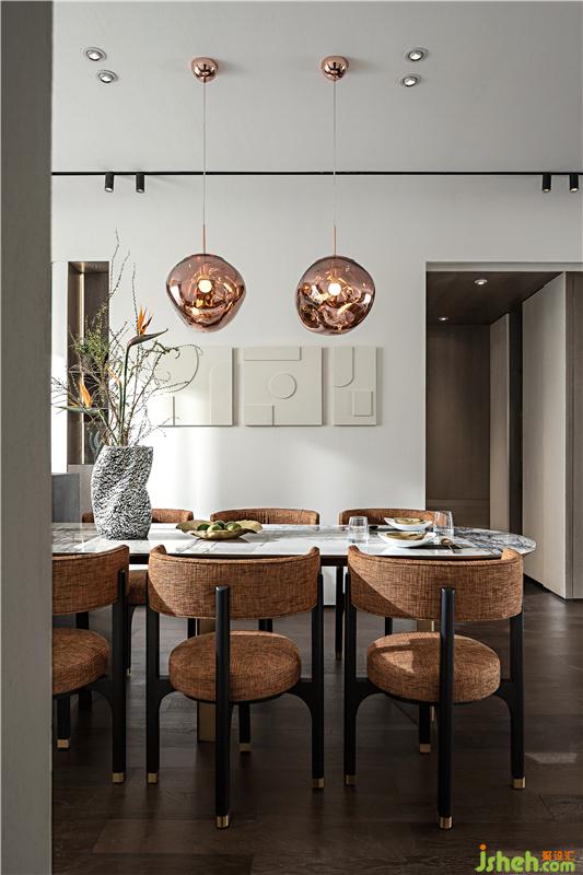 石材餐桌搭配藤質椅子,頗有度假放松的氛圍,在橘色調的氛圍中,家的“溫暖感”得到了突出和升華。