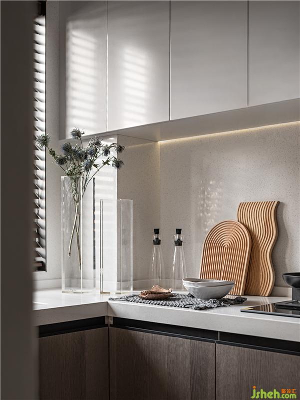 主臥的光影變幻除了源自自然的饋贈,更是來自設計師的精心設計:半開放式的洗手臺,讓光能肆意游走到空間的深處,并且完成視覺的延伸。每當光影隨著時間與材質(zhì)結(jié)合產(chǎn)出深淺細膩的變化,或靈動跳躍,或舒適慵懶,還原空間功能本質(zhì),給予居住者放松愜意的氛圍。