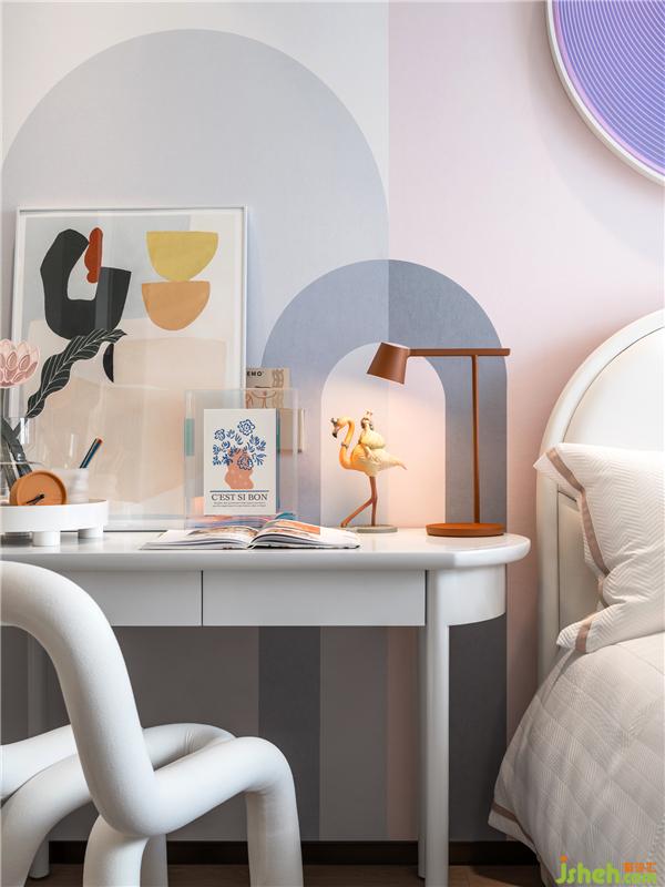 女孩房以低飽和度的淺粉紫色來強調出孩子特有的天真爛漫。色調與有趣家具的搭配,讓層次感與趣味性呼之欲出。