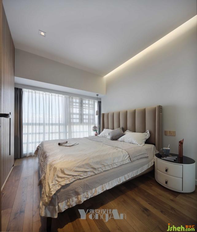主臥:整個(gè)空間干凈明亮,深淺原汁原味的木地板配上淺灰色的墻面乳膠漆,更加優(yōu)化了豐富了房間的層次效果,整面的落地窗戶配上深灰色的布藝窗簾,再加以潔白的窗紗,一縷陽(yáng)光從外面照射進(jìn)來(lái),此時(shí)此刻的疲倦,全部煙消云散了