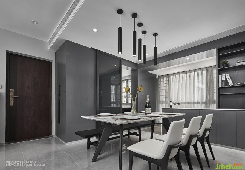 餐廳空間開闊明亮,幾盞吊燈造型簡(jiǎn)單大方,讓空間比例協(xié)調(diào)美觀,簡(jiǎn)單的點(diǎn)線面表現(xiàn),卻讓單調(diào)的線條,造就了不單調(diào)的韻味。白色的餐椅與大理石肌理餐桌搭配,簡(jiǎn)約清新的氣息迎面而來。