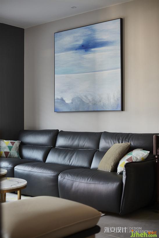 黑色皮革的沙發(fā)的透著冷靜與沉重,但是搭配兩個(gè)彩色多邊形抱枕,又不失俏皮,色調(diào)柔化了厚重的氣氛。