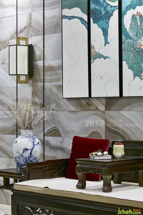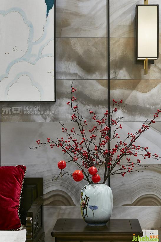 花鳥是新中式里必不可少的搭配,底色充滿質(zhì)感,射燈的照射下,柔和卻閃耀,整幅畫面似活似真。