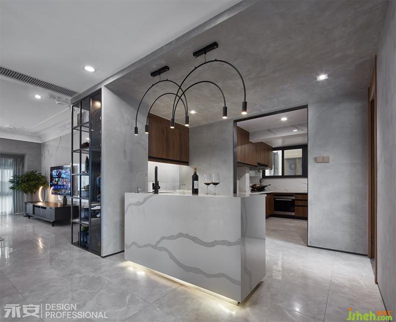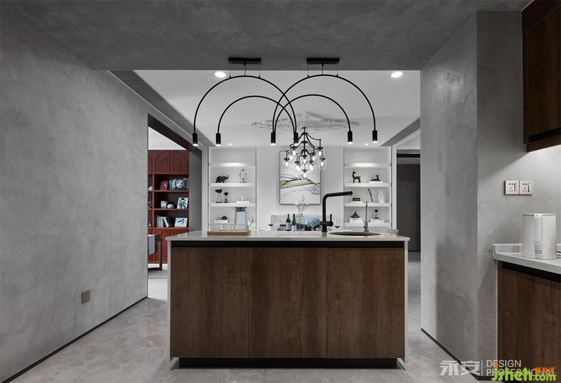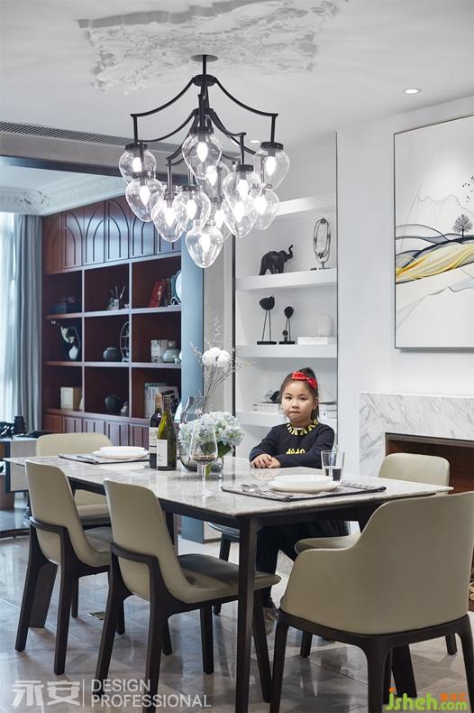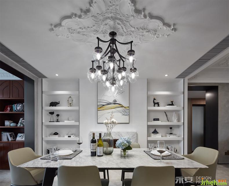 餐飲除了是生活必備部分以外更是一種交際和情感交流的區(qū)域,因此設(shè)計(jì)師對(duì)整體布局做了大的調(diào)整,不論是客餐廳還是休閑空間的布局都得到了釋放,而且還增加了島臺(tái)區(qū)域空間分配了中西餐櫥。被得以釋放的空間更是得到了最好光照亮度和視線景色。餐廳配以石膏雕花、頂燈是一個(gè)錯(cuò)落的橢圓形燈組,雕花、燈桿和燈珠恰恰處于餐桌中間點(diǎn),十分巧妙。傳統(tǒng)壁爐的演繹變化,它與書柜形成了良好的互動(dòng),為生活增添了許多審美的元素,增加了生活樂趣。
