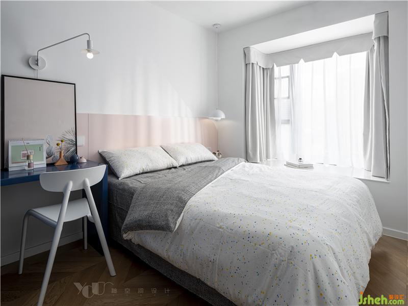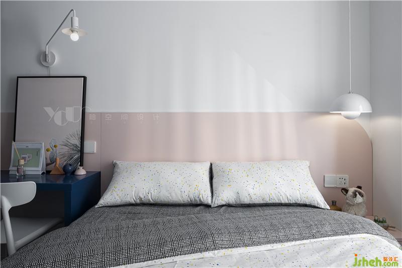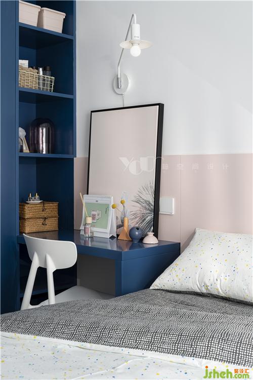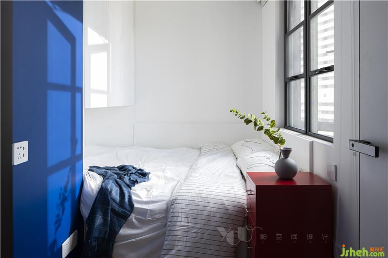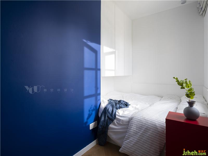 柜子、床頭延續(xù)了外廳的紅藍配色,但比例不大,整體的軟飾還是以素雅為主,更多的考慮了主臥室的睡眠功能,擔(dān)心大面色塊影響到入眠情緒。