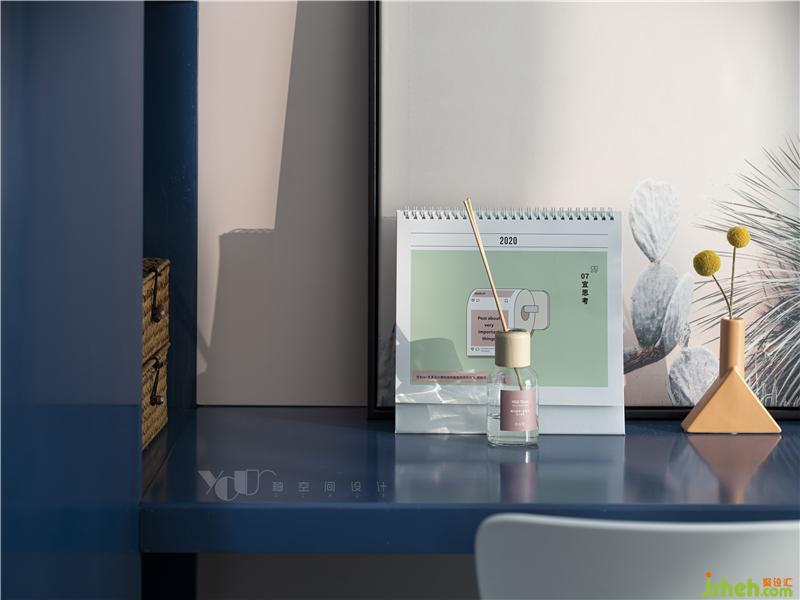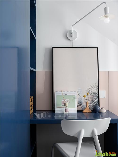 潔凈的餐桌大多時候是閱讀區(qū),夢幻的紅藍配色與酷酷的工業(yè)風(fēng)臺燈及書撐裝置組合,挺有意思的搭配,拉近了童話和現(xiàn)實的距離,深圳室內(nèi)設(shè)計師也讓空間表現(xiàn)層次更加豐富了一層。