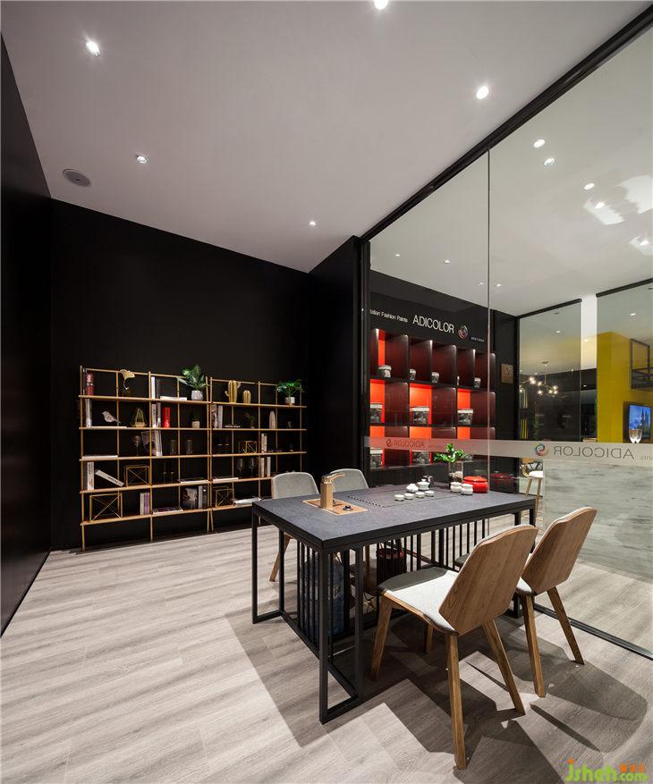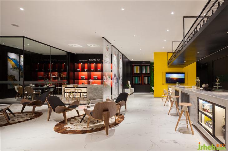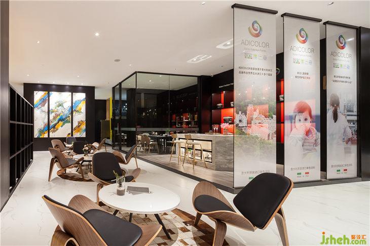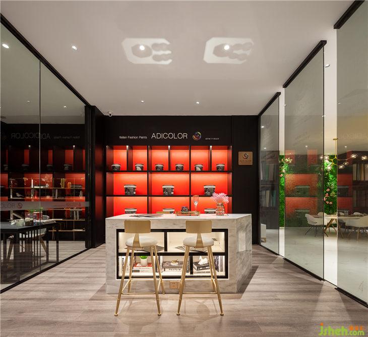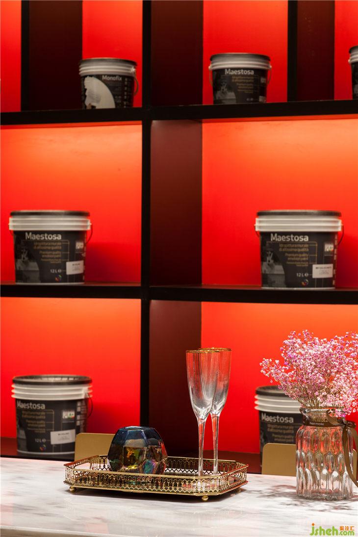 小吧臺(tái)區(qū)更顯精致,儲(chǔ)物展示柜的黑與愛(ài)馬仕紅形成鮮明對(duì)比,呈現(xiàn)出強(qiáng)烈的視覺(jué)沖擊感,突出單色涂料產(chǎn)品的“藝術(shù)”這一特點(diǎn)。
